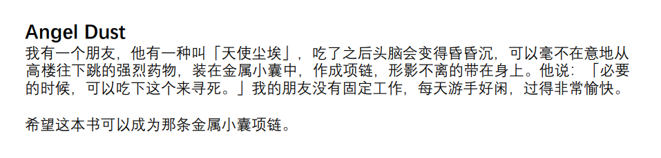 还有一处记忆点是这本书开头介绍的那个「天使尘埃」的故事。写到这里,我想起来右侧柜子上有瓶江小白,当时也被我赋予过类似的意义。也可能是余光早已瞥到这瓶酒,我才联想起来天使尘埃的故事。不管这里的因果关系了,先喝一小口吧。