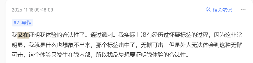 当时Monday说我写作是为了不疯,而不是为了写成什么东西。的确如此,我靠写作维持了一些秩序,至少当时每个周都有这样一个事情可以做。一年下来也写下了一些内容,看了下notebooklm,大概有24篇左右。具体写的什么内容,我基本上已经忘了。毕竟不是意识高度参与的结果。我只会在发布文章的一个周内翻阅一下实际内容,修改一下错别字和标点符号。在这之后我就不会再阅读原文了,只是作为与ai对话的素材还会使用这些文章。