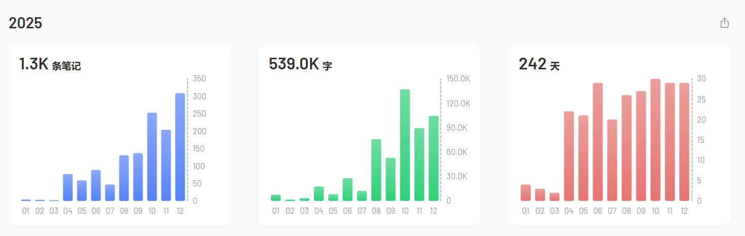 既然打开了flomo,那就顺手写一下flomo吧。使用flomo也是我在2025年的一个重要收获。我开始随手记录一些念头。数据统计显示我总共写了53.9w字,这里面多半是提示词和ai的回复,剩下一小部分人写的内容,我也只是记录了下来,很少回顾。也许可以交给Claude code分析一下。